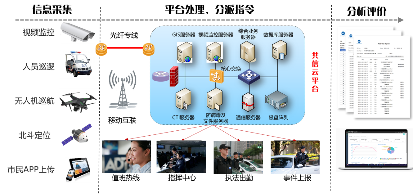 上海安达泰、北京安达泰、郑州大华安防三大接警运营中心统一接入部署在云数据中心的共信接警平台,实现三大中心的虚拟化统一管理。数据有容灾备份、人员可协同接警,支持报表与可视化数据看板定制开发。